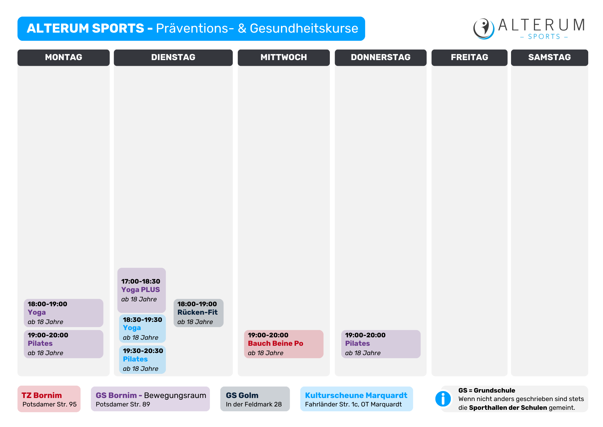 Wähle deinen passenden Kurstag und entdecke unser vielseitiges Angebot: